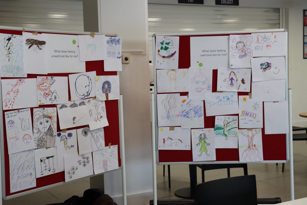 Artist Eleanor Beer delivered a workshop, asking attendees to represent their experience of feeling well and unwell through drawing, after documenting the morning’s talks. Eleanor also live captured the event as mural.
